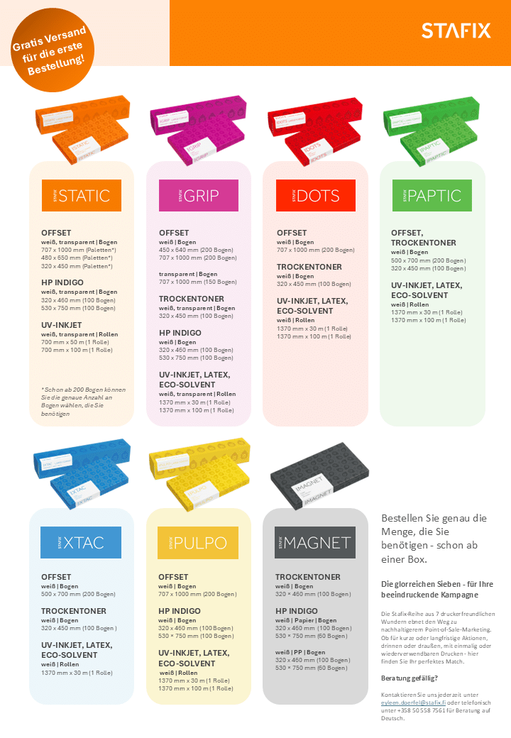 Bestellen Sie unsere kostenlose Mustermappe und entdecken Sie die nachhaltige Zukunft der selbstklebenden POS-Materialien. Stafix-Produkte wurden entwickelt, um Ihre Kampagnen zu optimieren.