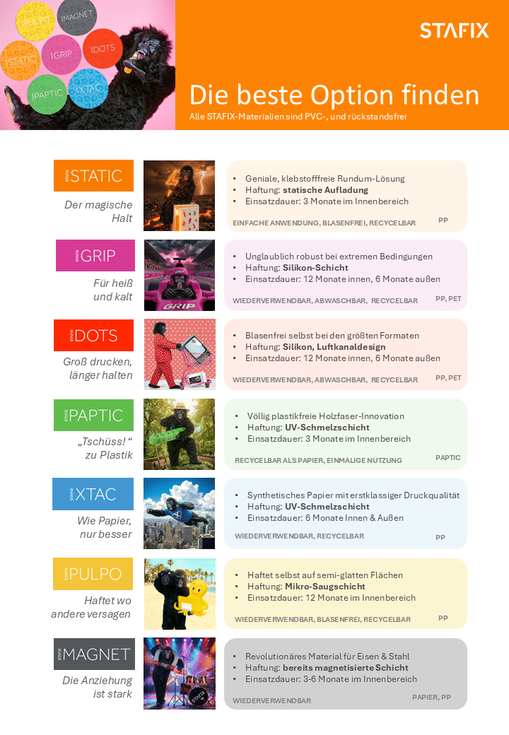 Retail ist ein wilder Dschungel. Nehmen Sie den Stafix-Gorilla als Ihren Guide: Er weiß wie man ein Publikum fesselt – ganz ohne klebriges Chaos. Genau wie unser Maskottchen erobern unsere Materialien mühelos jedes Gebiet und behaupten sich auf jeder Oberfläche – dabei hinterlassen sie nur Spuren, die wirklich zählen.